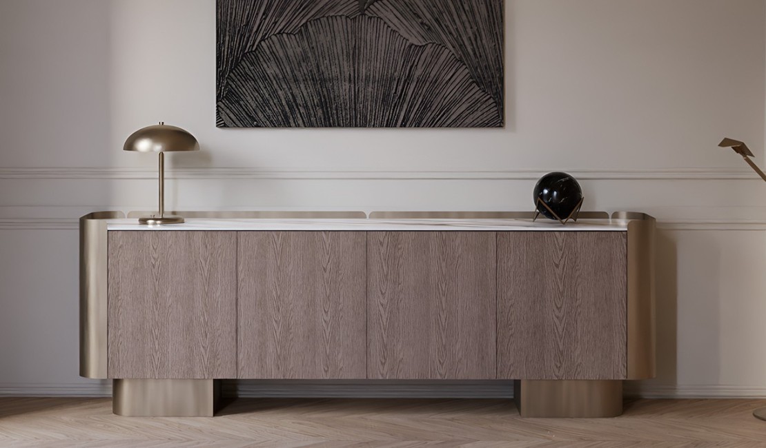 Wooden sideboard with metal inserts available in various colours and dimensions. Optional addition of ceramic top available in various colours.